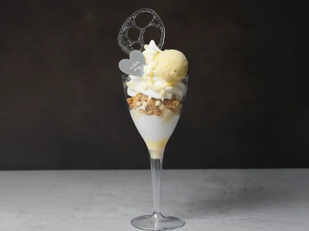 ホワイトデーブランは、爽やかな洋梨とバニラのコクが調和したデザートです。構成要素としては、ミルキーでコクのあるジャージーミルクソフトにグラスバニーユとサクサクのホワイトチョコパフをトッピングし、バニラソースの上に、はちみつレモンジュレと洋梨を重ねています。