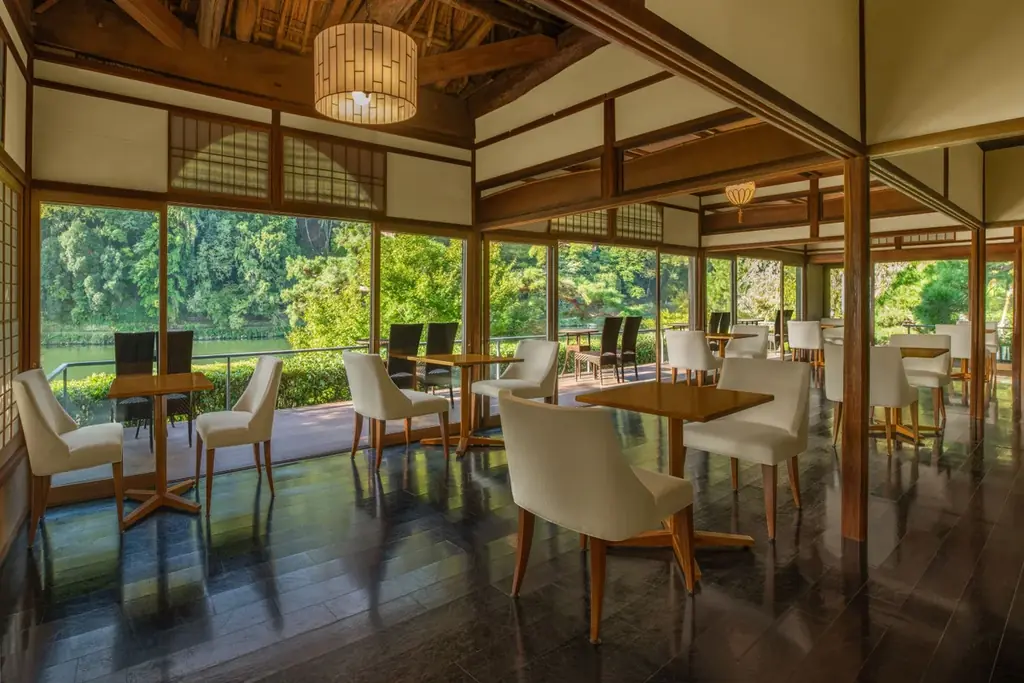 会場の「茶寮 八翠」は築100年を超える歴史的建造物「八賞軒」の伝統を継承する空間です。保津川と嵐山の景観をテラスから望める設計で、テーブル席24席、テラス席10席、合計34席で運営されています。営業時間は11:00~17:00です。