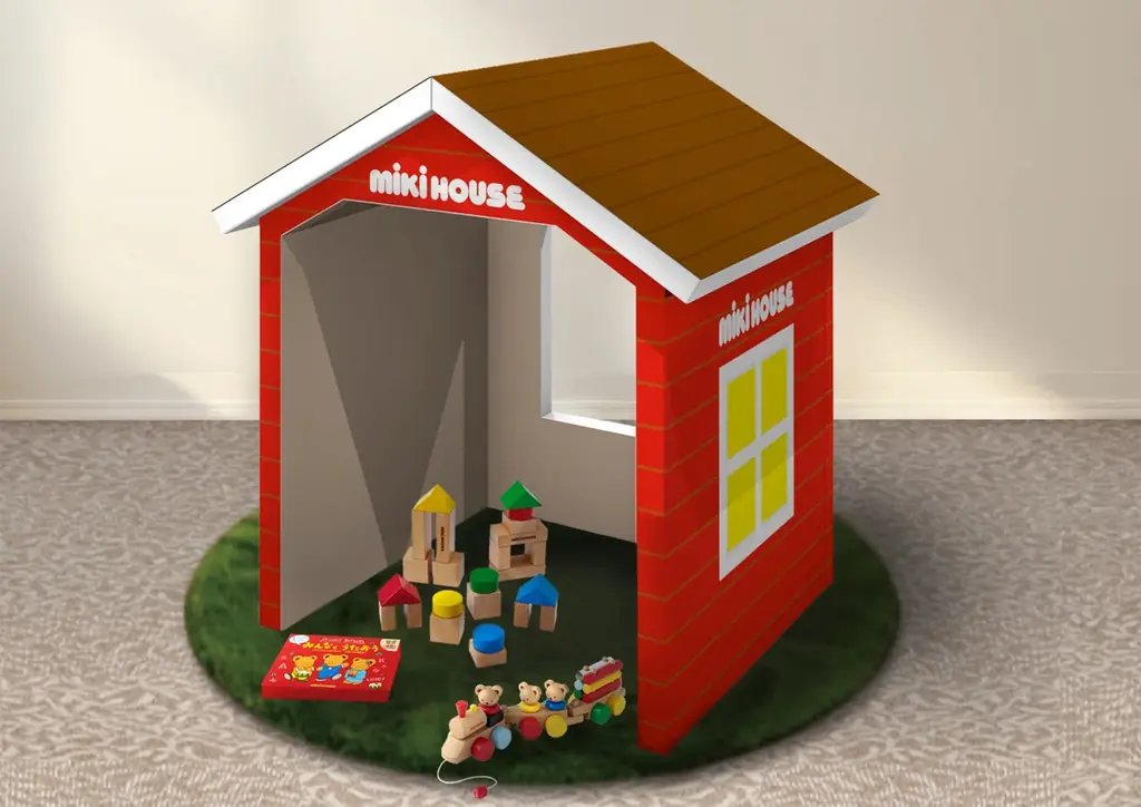 プレイスペースは靴を脱いで遊べるカーペット敷きの芝生風スペースに、柔らかなブロック素材で作られたロッジ風テントや玩具、音の出る絵本を備えています。ロッジ風テントの寸法は幅約91cm×奥行90cm×高さ117.6cmです。