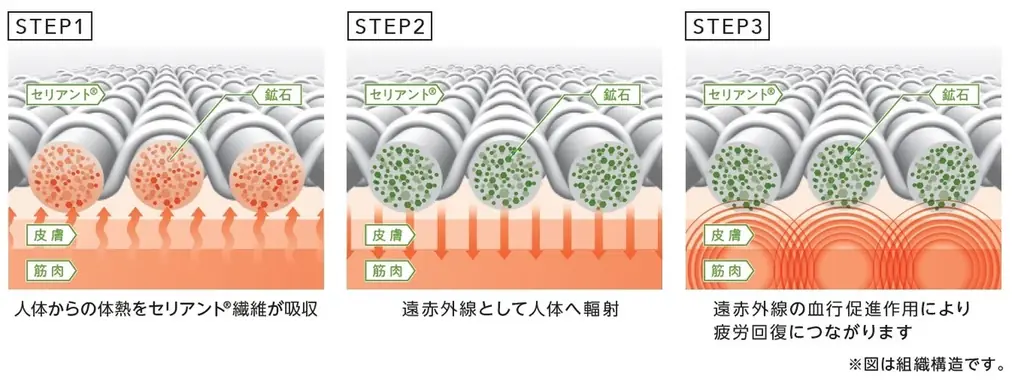 具体的なプロセスは次のとおりです。STEP1で人体からの体熱をセリアント繊維が吸収し、STEP2で遠赤外線として人体へ輻射(ふくしゃ)、STEP3で遠赤外線の血行促進作用により疲労回復につながると説明されています。ただし、効果には個人差がある旨の表記があります(注釈※3)。