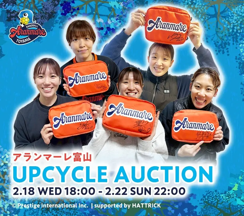 プレステージ・インターナショナルが運営する女子スポーツチーム、アランマーレ秋田(バスケットボール)、アランマーレ山形(バレーボール)、アランマーレ富山(ハンドボール)の3チームは、バリュエンスジャパン株式会社が運営するスポーツチーム公認オークション「HATTRICK Auction」にて、初のアップサイクルプロジェクト「UPCYCLE AUCTION」を実施します。開始は2026年2月18日(水)18:00から、終了は2026年2月22日(日)22:00です。
