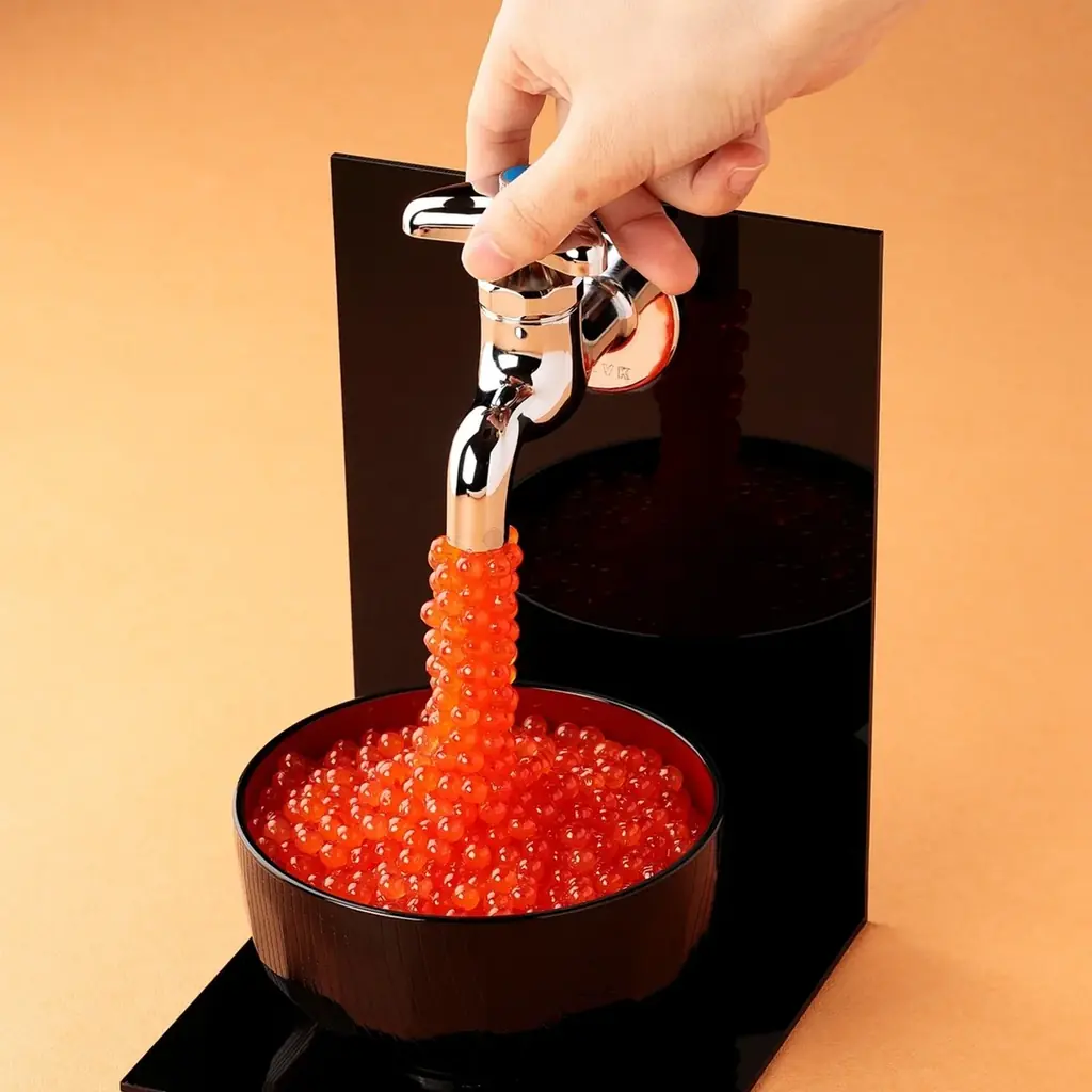 特に「夢の蛇口イクラ」はSNSで注目を集めたアイデアを実際の商品化したもので、いくらの粒は一粒ずつ手作業で取り付けられています。