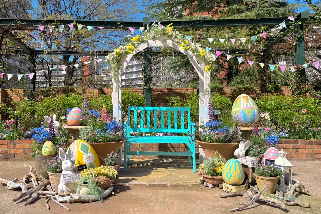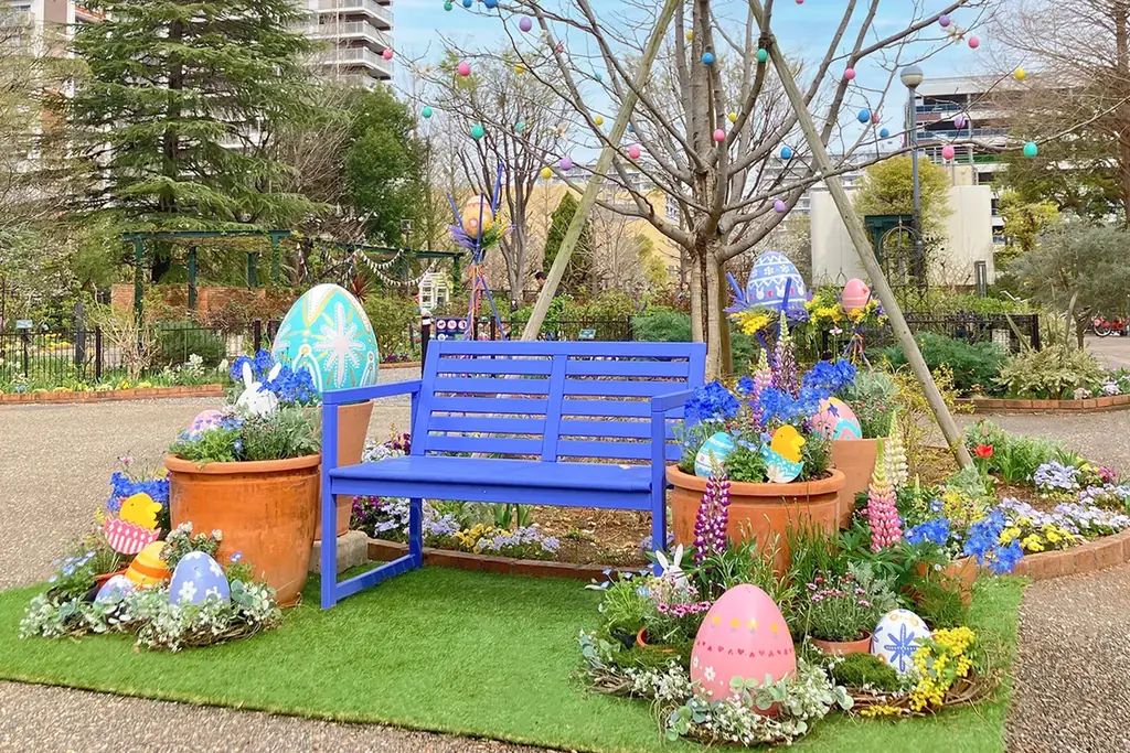 園内にはイースターをテーマにしたフォトスポットが複数設置されます。第一園芸のガーデナーがデザインしたカラフルなイースターエッグやうさぎのモチーフを配したデコレーションが、春の花々と合わせて写真映えする背景を提供します。設置期間はいずれも3月21日(土)〜4月12日(日)です。