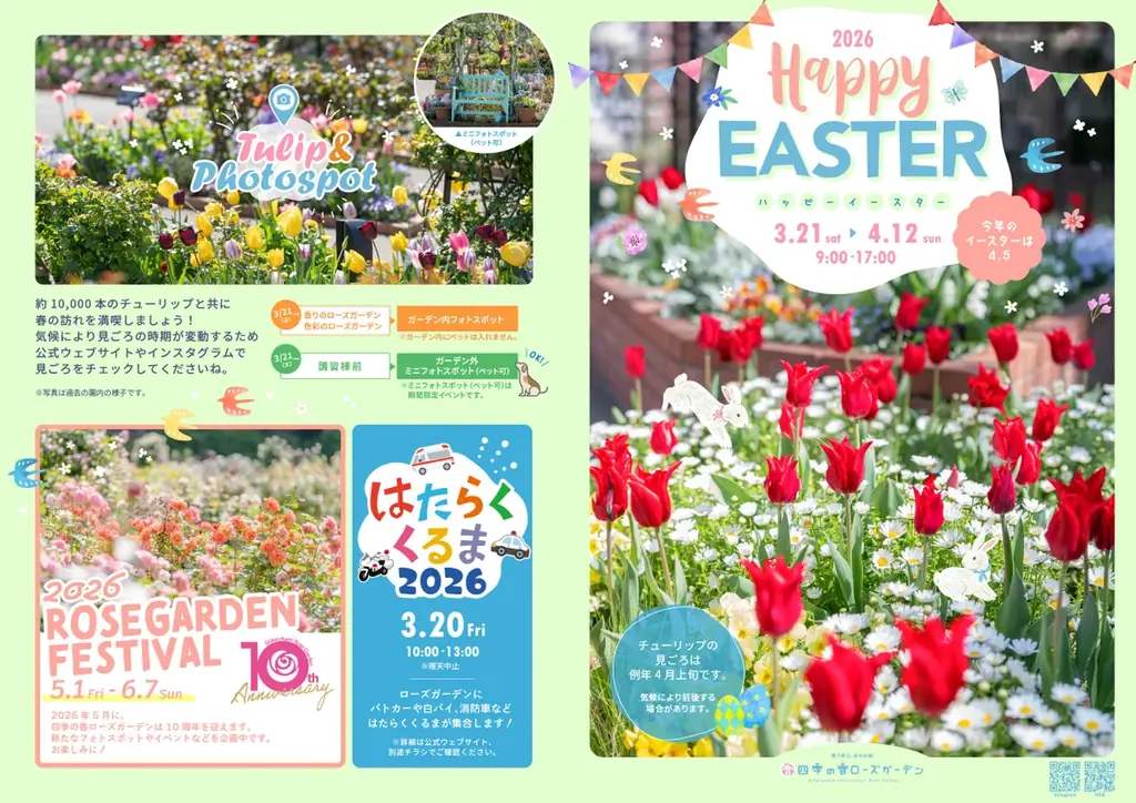 | 主なイベント | ぽんぽんウサギのアレンジメント(3/28・事前抽選、参加費1,800円、申込締切3/13)、チューリップ摘みとり(4/12・当日受付、300円、各回15名)、はたらくくるま(3/20・10:00〜13:00、無料) |