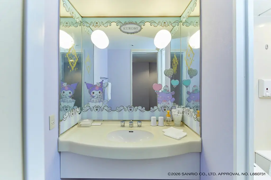「クロミルーム」はゴージャスでややいたずらっぽい雰囲気を表現しています。遊園地でパーティの準備をしているクロミと子分のバクの様子が壁一面に描かれ、お部屋の窓側やバスルーム、クローゼットの鏡、額縁に飾られた複数の作品などで世界観が随所に感じられます。