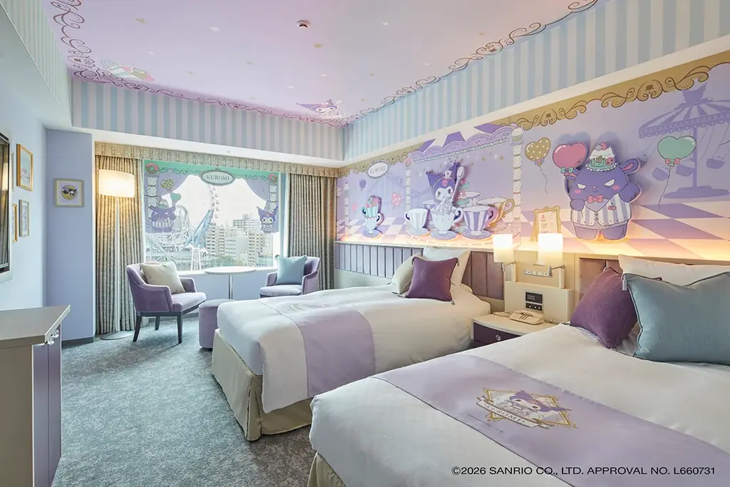 こちらも宿泊プランにはオリジナルグッズ(ぬいぐるみ・ヘアターバン・ポーチ)が含まれ、お一人様につき1セットが提供されます。客室は東京ドーム側指定で、窓からの眺望と内装の演出が組み合わさった体験を提供します。