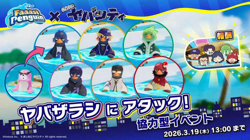 株式会社ヒストリアは、サバイバルアクションレース『Faaast Penguin』(ファーストペンギン)にて、ゲーム実況グループ「まじめにヤバシティ」とのコラボイベントを開催すると、2026年2月20日 12時08分付のリリースで発表しました。リリース本文には、コラボの具体的な内容、期間、関連リンクなどが詳述されています。