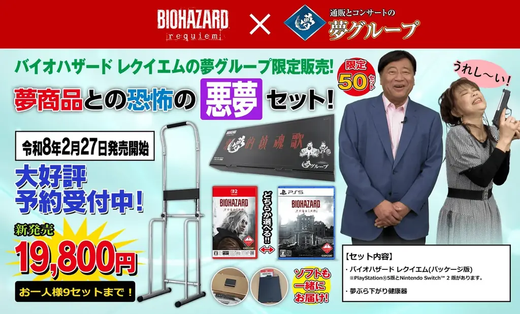 株式会社カプコンが2月20日12時12分に発表したプレスリリースによれば、サバイバルホラーの最新作『バイオハザード レクイエム』(発売日:2026年2月27日)と、通信販売やコンサートで知られる株式会社夢グループのコラボレーションが実現しました。本コラボは、ゲーム本編と夢グループの人気商品を組み合わせた限定商品を、全世界で50セット限定にて販売するというものです。