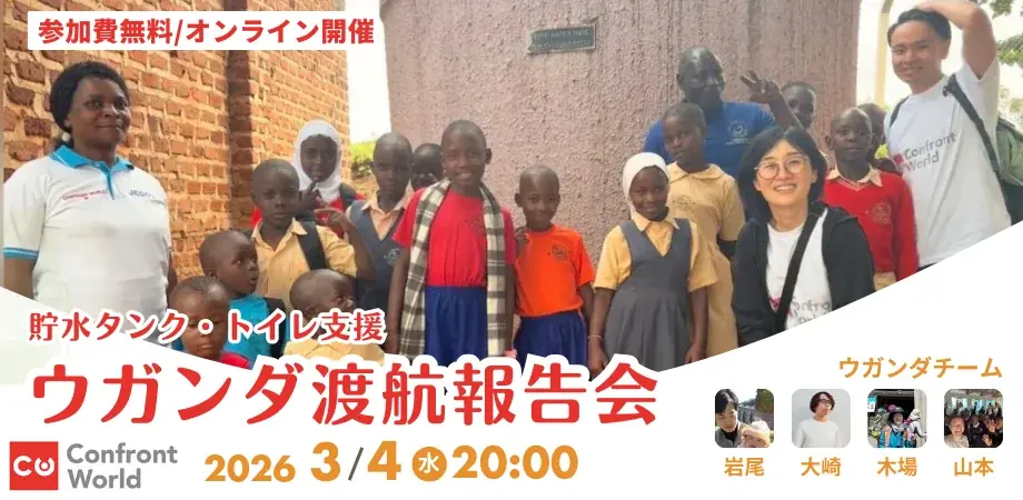 2026年3月4日(水)20:00〜22:00にオンラインで開催される「ウガンダ渡航報告会」は、特定非営利活動法人コンフロントワールドが現地での最新の活動報告を行うための場です。プレスリリースは2026年2月23日13:40に発表され、同団体が2025年12月および2026年2月に実施した渡航の内容を、現地から帰国したスタッフ4名が直接報告します。