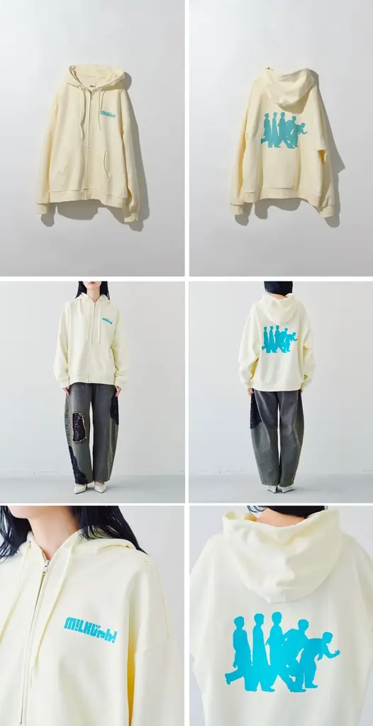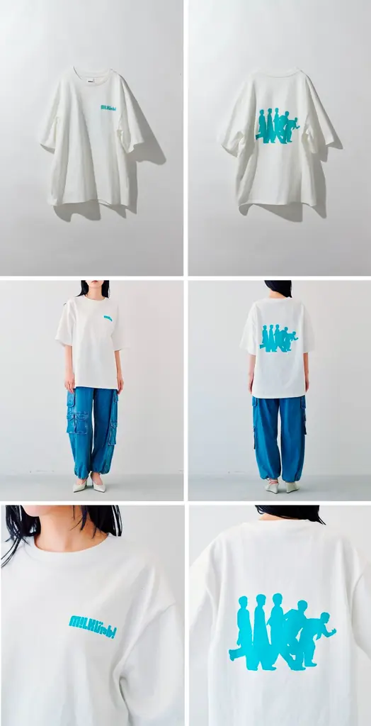 発売された新作は、シルエットプリントパーカー〈クリーム〉とシルエットプリントTシャツ〈オフホワイト〉の2型です。両アイテムともM!LKをイメージしたやさしい“ミルクカラー”がボディカラーで、背面にはメンバー5人のシルエットがターコイズブルーでプリントされています。