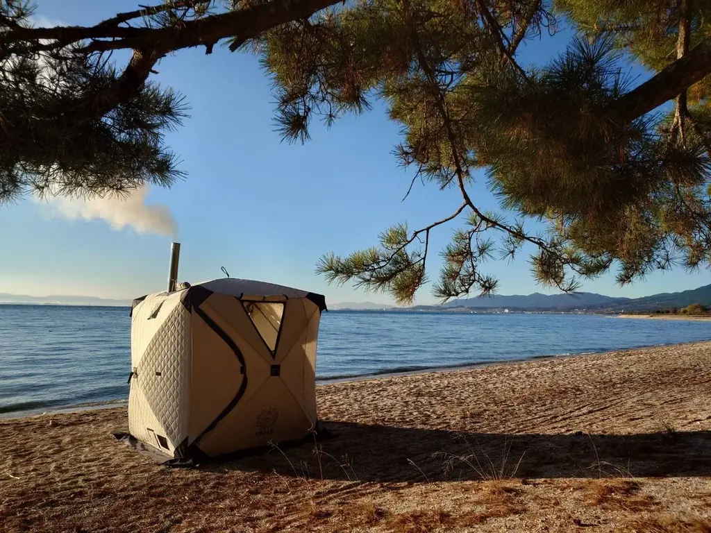 テントサウナ等のアウトドア機材で身体を徹底的に温めます。レンタル機材を用いるため、極限までの発汗を自分で作り出すプロセスが重要視されます。