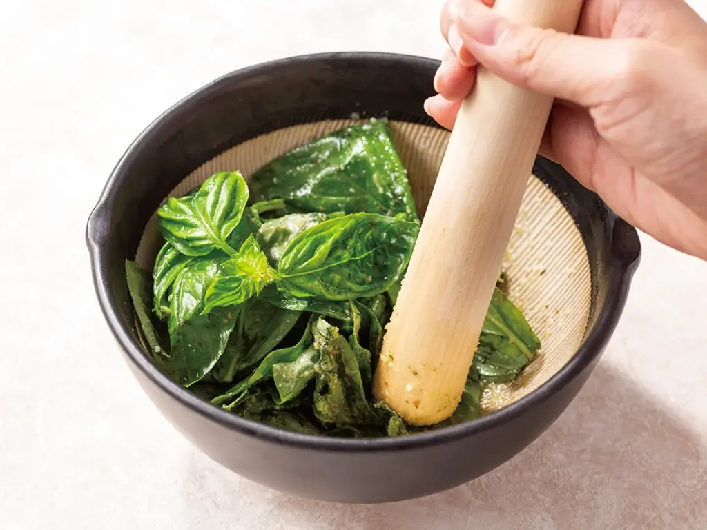 メニューの中でも『擦りたてフレッシュバジルのジェノベーゼ』は、来店客が実際にバジルを擦ってソース作りを体験できる仕様になっており、香りを直接感じながら仕上げることができます。この体験要素は、五感に訴える提供方法の一例です。