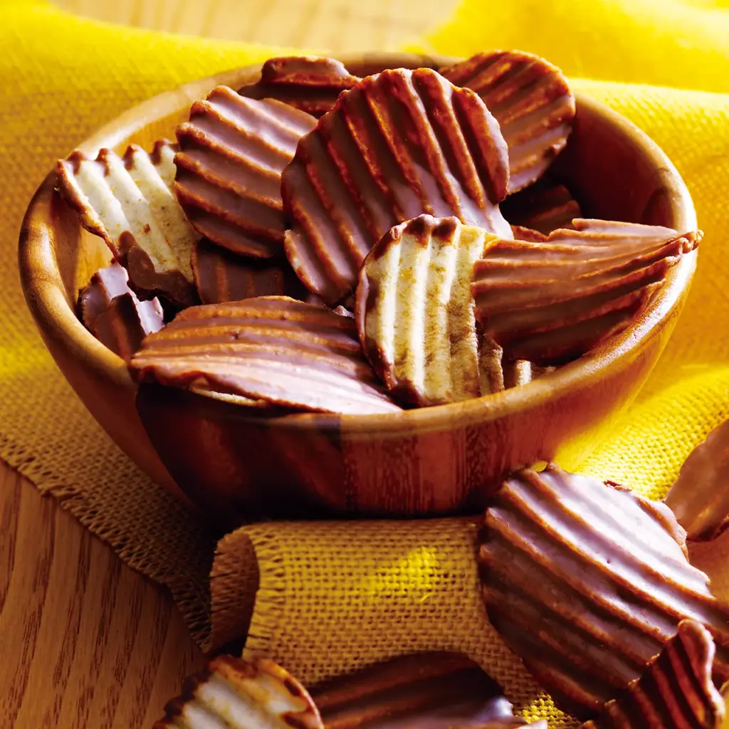 ポテトチップチョコレート[オリジナル] 190g 1,188円(本体価格1,100円) ポテトチップの片面にチョコをコーティング。チョコの甘さと塩味のバランスが特徴