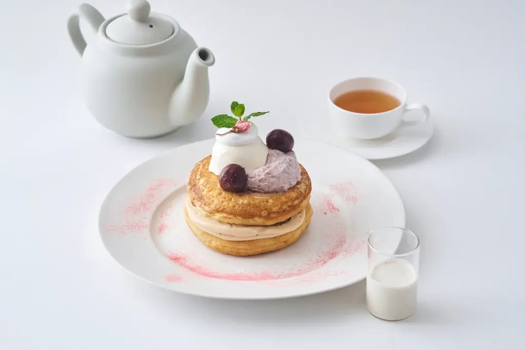 パンケーキ生地は「ふわふわ・もっちり」で、ややセイボリー(塩味がきいた)な仕立てが特徴です。この生地に旬のチェリーをじっくり煮込んで甘酸っぱさと深いコクを引き出したフィリングを重ね、マスカルポーネを合わせたまろやかなクリームで調和させています。