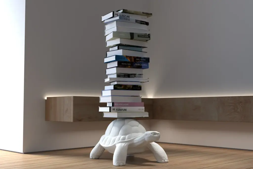 タートルキャリーブックケースは亀が本を背負うという発想から生まれた収納家具で、アートピースのような佇まいが特長です。ベースにリサイクル可能なポリエチレンを、シェルフに頑丈なスチールを組み合わせ、安定した収納力と耐久性を実現しています。