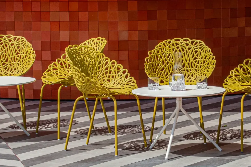 バカナチェアはブラジルのデザインユニット「スタジオカンパーナ」とのコラボレーション作品です。名前はポルトガル語のスラングで「イケてる」「かっこいい」を意味し、ねじれたような形と絡み合う曲線が特徴です。屋外使用にも対応しており、テラスやカフェ空間などで存在感を発揮します。