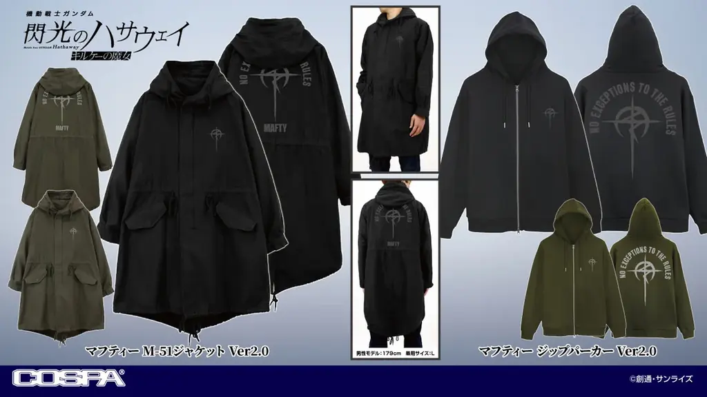 現在公開中の最新タイトル『機動戦士ガンダム 閃光のハサウェイ キルケーの魔女』からは、マフティーをモチーフにしたM-51ジャケットとジップパーカーが登場します。どちらも作品の象徴的な配色とマークを配したデザインです。