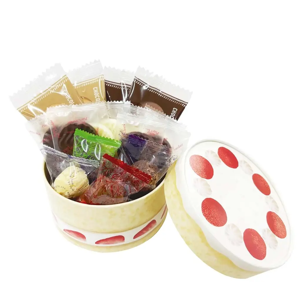 詰め放題は、ケーキの設計をイメージした直径約12cm、深さ約6cmの箱に個包装されたチョコレート・お菓子を詰める形式です。詰め放題用の箱は参加者にお渡しし、その場で詰めて持ち帰ることができます。写真はイメージのため、実際の内容は異なる場合があります。