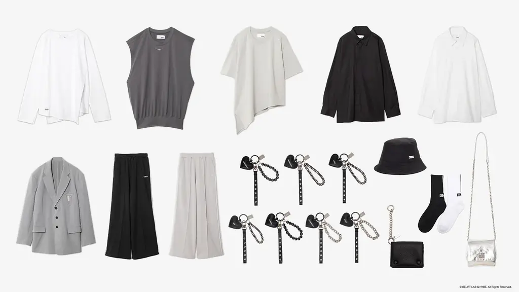 各アイテムはENHYPENの7名それぞれのイメージを反映している点が特徴で、シンプルながら存在感のあるディテールが配置されています。例えばシャツやジャケットは光沢感を活かしたフォーマル寄りの佇まい、バッグやチャームは小物としてのアクセントを添える仕様です。