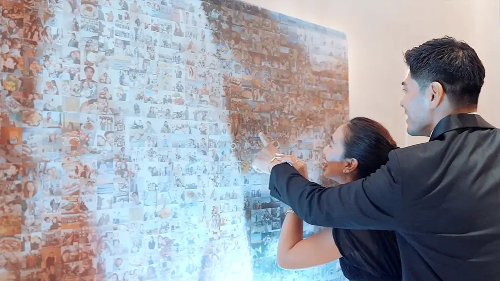 しかし本物のパネルを用いて壁を作ると費用が嵩むため、代替案として巨大なタペストリーで“壁”を再現する手法を採用しました。制作にはゲストも巻き込み、おふたりとゲストの“愛を感じる瞬間”を収めた合計3,500枚もの写真を組み合わせることで「愛の壁」は完成しました。