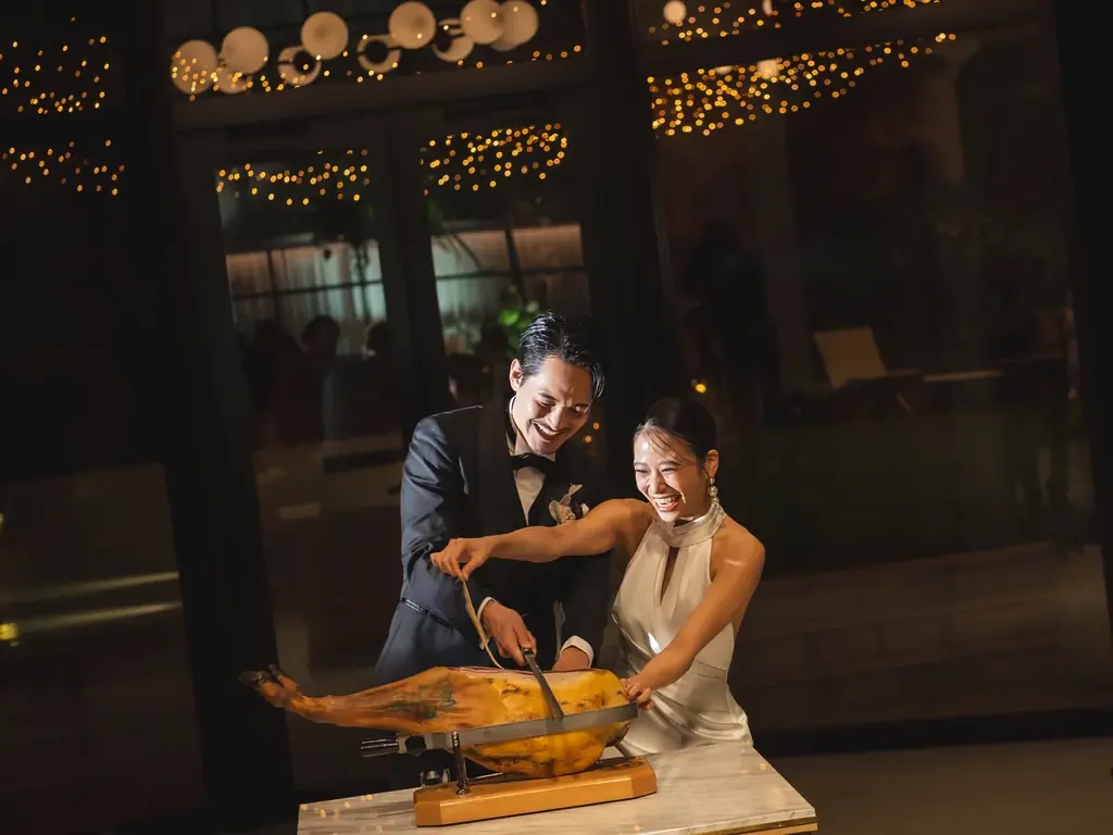 通常の結婚式での共同作業演出であるケーキ入刀に対し、おふたりはその定番を避けたいという希望を持っていました。そこで、番組で何度も登場した「生ハム」を象徴的に取り入れる案が採用されました。