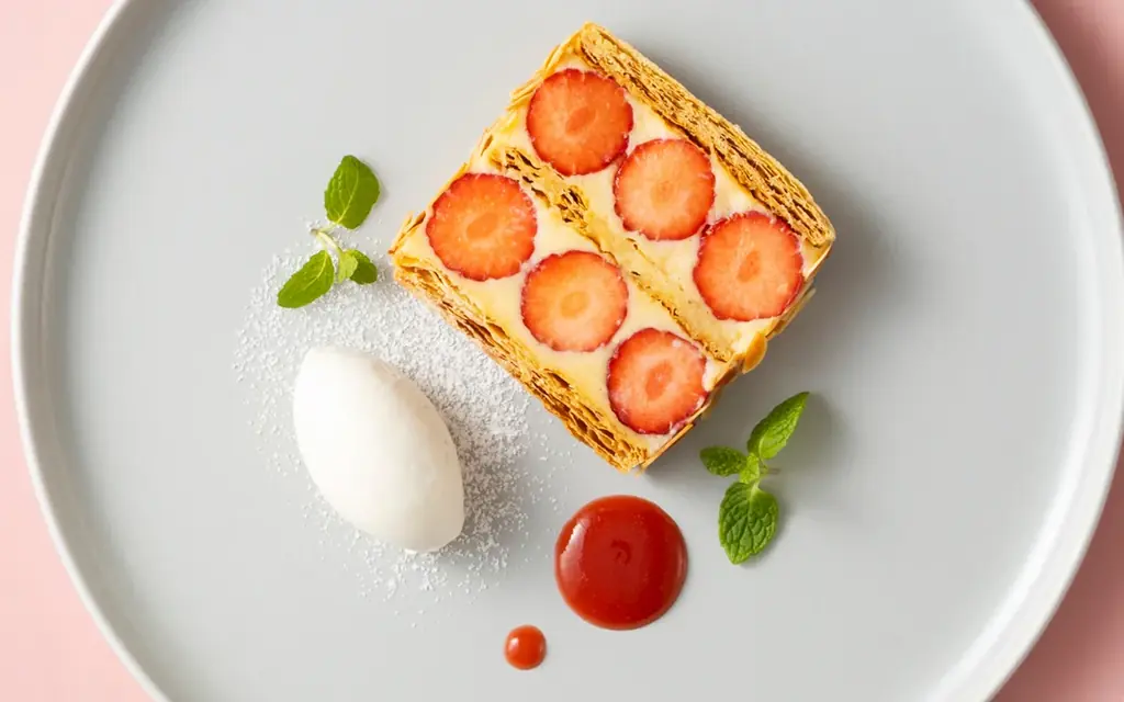 実演メニュー:苺のミルフィーユ(町村牛乳のアイスクリーム添え)