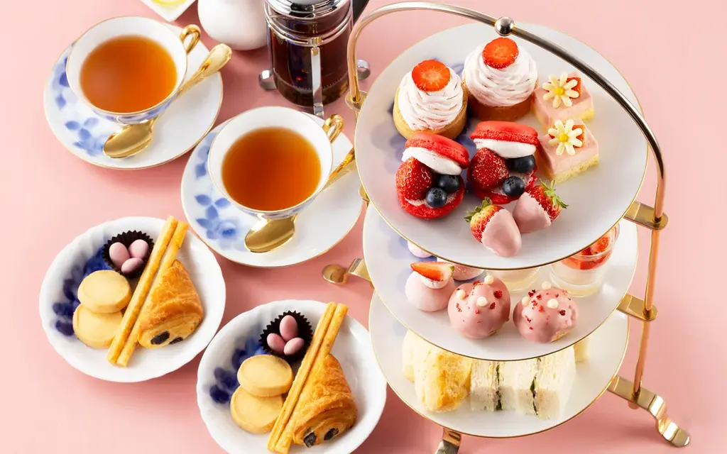 本館1階のロビーラウンジ ミザールでは、苺&ミルクをテーマにしたアフタヌーンティーセットとパフェを提供します。アフタヌーンティーは提供数に制限があるため、早めの確認が推奨されます。