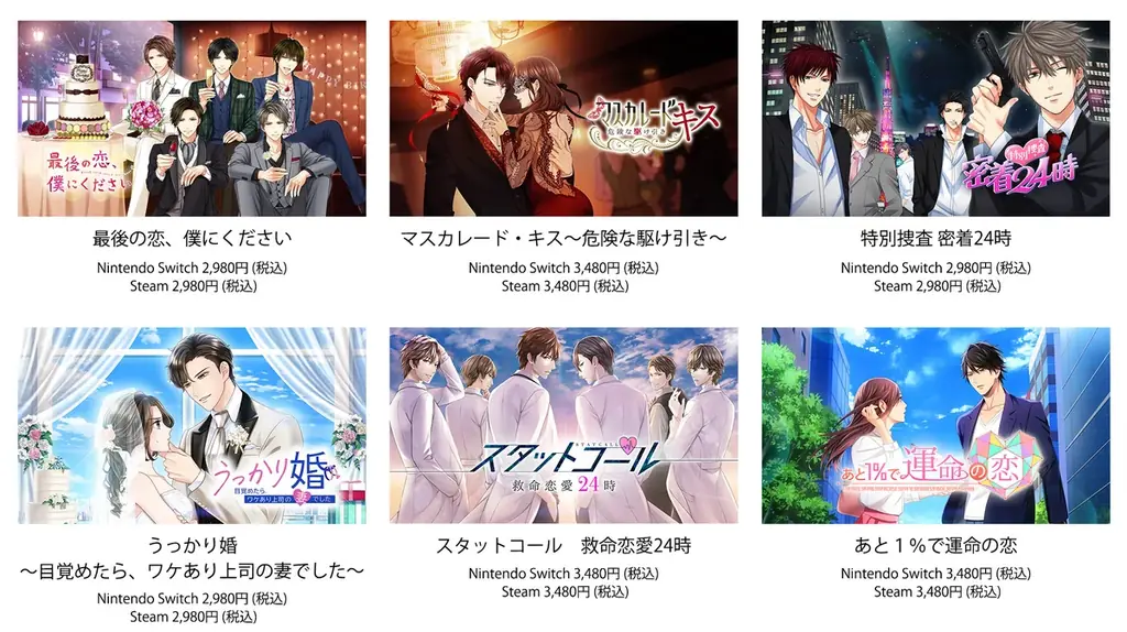 各タイトルはジャンルとしてアドベンチャー/女性向けダークファンタジーADVなどに分類され、対応言語や価格、対象年齢がそれぞれ異なります。発売情報や公式サイトへのリンクも併せて紹介します。
