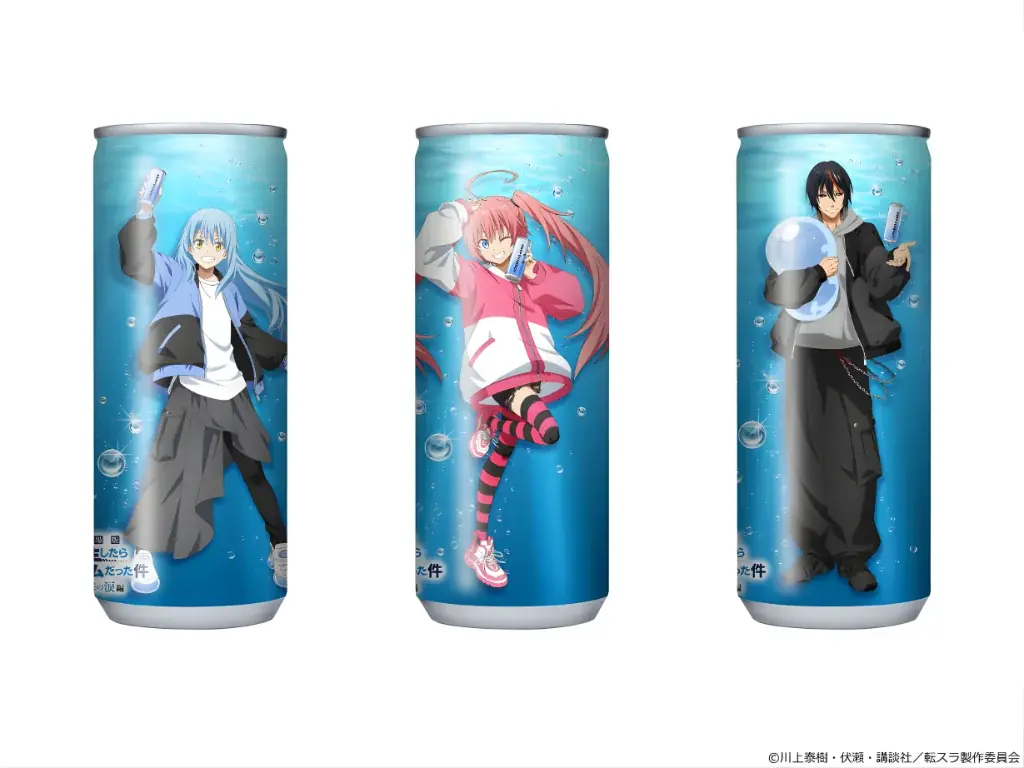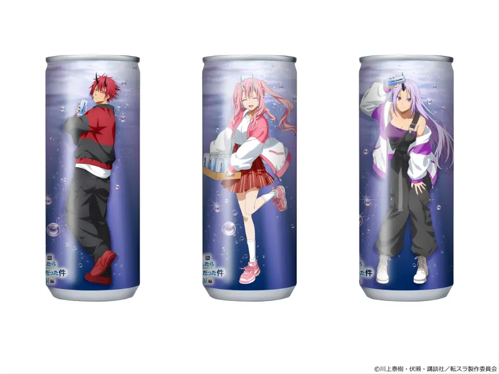対象キャラクター:リムル、ミリム、ディアブロの3種の描き下ろしイラストが存在します。フレーバーとしてはサイダー味をベースに、青い魔力のイメージを飲料で再現しています。