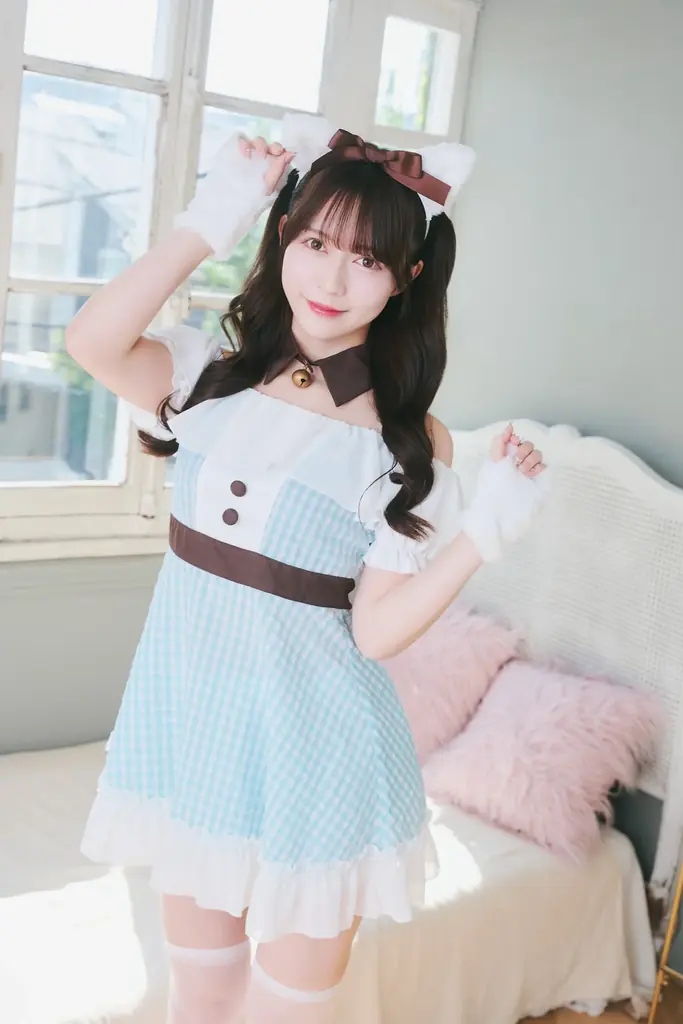 - 水色チェック柄、ワンピース型、露出が少なめで幅広い層向け