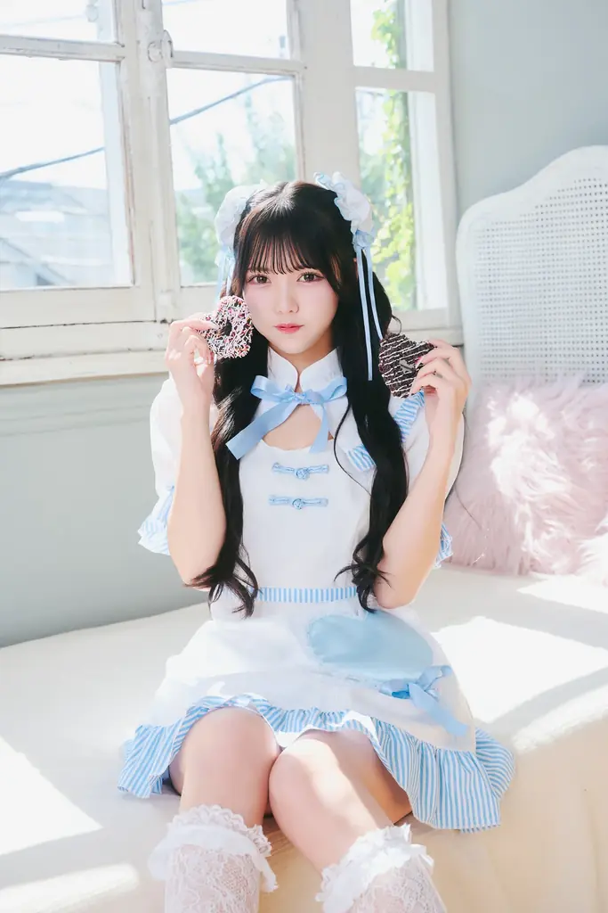 キャンディハートチャイナはライトブルーとホワイトの配色がホワイトデーらしさを引き立てます。キャンディをイメージしたストライプ生地や、丸みのあるシルエットの袖が甘さと可愛らしさを演出するチャイナ服です。