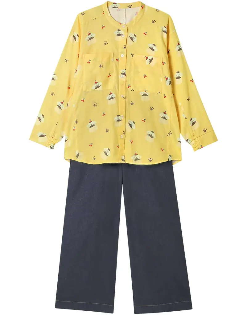 ボトムは先染めの糸を使いデニム風に仕上げたデザインで、キャラクターイメージに合わせたステッチカラーがアクセントになっています。ウエストはゴムを2本使用し、おなかまわりを締めつけにくくリラックスタイムにも適した仕様です。