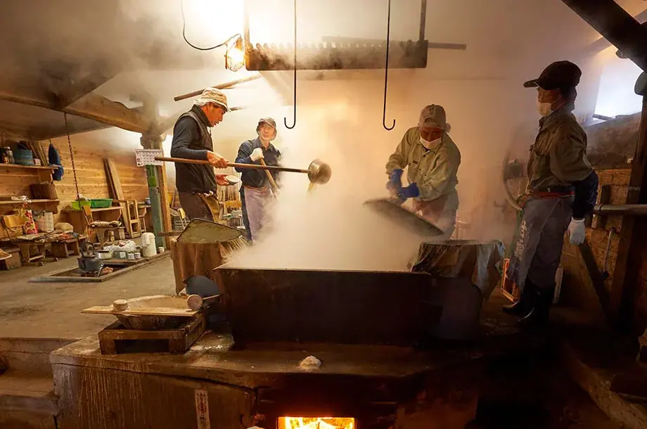 製法は一番釜で灰汁を取り、澄まし桶で不純物を沈殿させ上澄を二番釜で高温にて炊き、三番釜は松の薪火で仕上げる工程が継承されています。型に流す瞬間の見極めが製品の品質を左右する重要な技術です。近年は担い手減少で存続が危ぶまれる時期もありましたが、移住者の参加により二百年の火がつながっています。