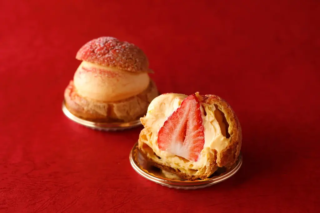 - 価格:918円。大粒で濃厚な味わいとみずみずしさが魅力の「ロイヤルクイーン」を丸ごと1粒入れたシュークリーム。自家製カスタードとビスキュイ生地の食感が楽しめます。