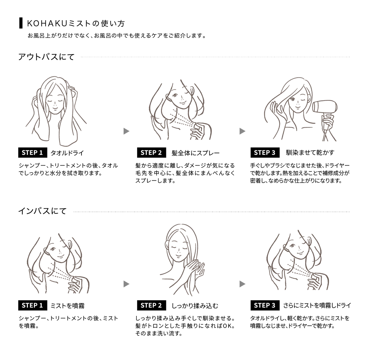 KOHAKU MISTは、日常の乾燥やうねり、ストレスによるダメージを受けた髪へ内部からの補修を行い、翌朝の手触りやまとまりを改善することを目的とした集中ケアミストです。ドライヤーの熱を利用することで成分が髪内部に浸透しやすく働きかける点が大きな特徴として紹介されています。