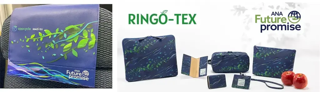 RINGO-TEX®を用いた導入例として、ANA Green Jetのヘッドレストカバーや革小物、青森出身の王林さんのブランド『What Is Heart (わいは)』とのコラボレーション製品が挙げられます。これらは実際に商用利用されており、素材の実用性とデザイン適応性を示しています。