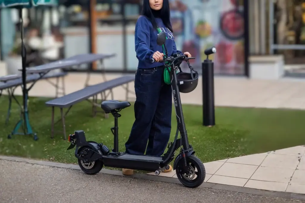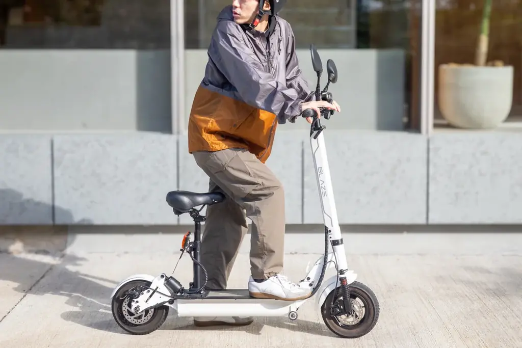 立ち乗りと座り乗りの両方に対応した折りたたみ式電動スクーターで、約3.5時間で満充電、走行距離は約35kmです。前後サスペンションにより長時間でも疲れにくい設計です。