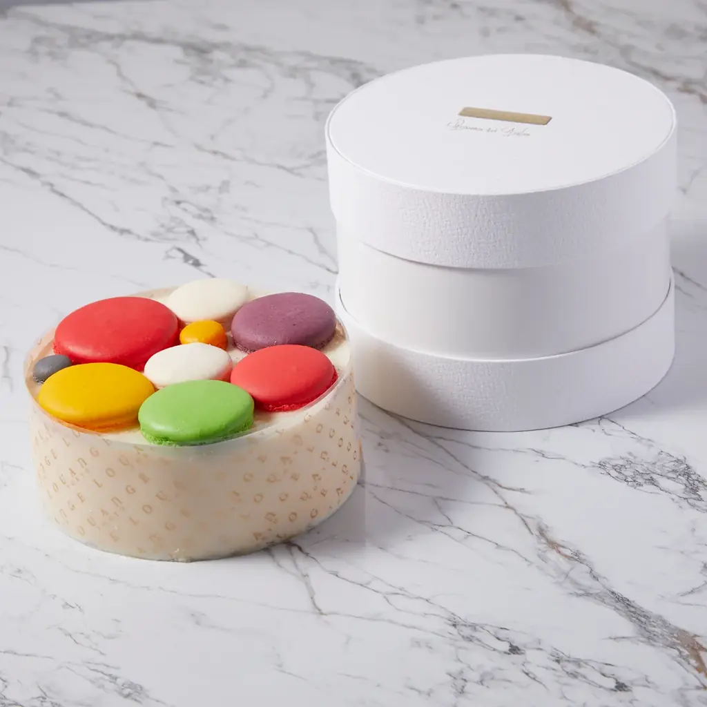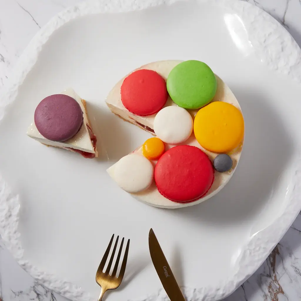 マカロンチーズケーキはデンマーク産クリームチーズをベースに苺のコンフィチュールとレモンの香りを重ね、色とりどりのマカロンをトッピングして視覚的な華やかさも加えています。販売はオンラインストアでの全国配送が中心です。