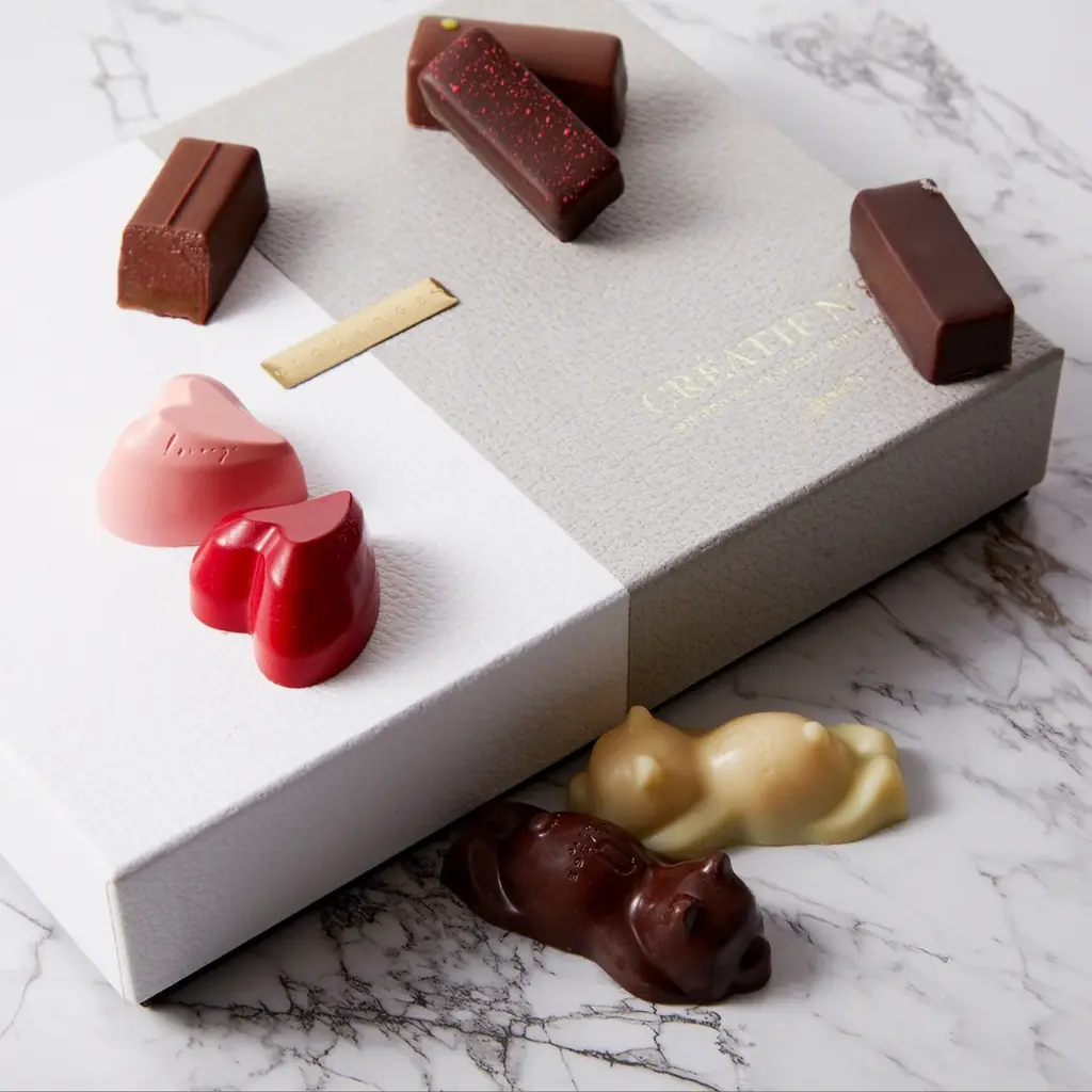 ショコラのラインでは世界大会優勝のパティシエ同士のコラボ商品や、素材を活かしたショコラサンド、ギモーヴの二重構造といった独自の食感提案があります。フィンガーサイズのボンボンショコラはギフトに適した4個入・8個入の設定です。
