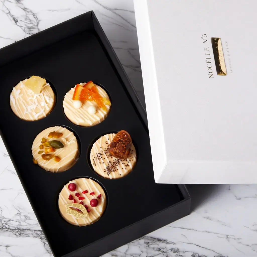 - ハーサム ショコラ:5個入 ¥4,200(銀座店・六本木店・オンラインストア)— マカダミアキャラメル、コーヒーマロン、ピスタチオ&オリーブオレンジ、フランボワーズリュバーブ、ピニャコラーダの5種。