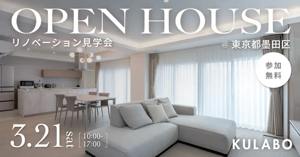 愛知県・岐阜県・東京都(一部エリア除く)でリノベーション事業を展開する株式会社sumarchのブランド、リノベーションスタジオKULABOが手掛けた、築21年のマンションリノベーションを公開する見学会が東京都墨田区で開催されます。写真だけでは伝わりにくい素材の質感や光の演出、間取りの工夫を実際に体感できる機会です。