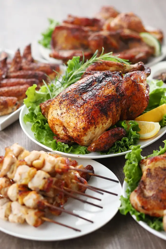 鳥周の主力商品は、ロティサリーオーブン(回転ロースター)で焼き上げるローストチキンと、皮と胸肉を交互に刺した名物の串焼です。調理方法と素材の特徴が、味わいや保存性に影響を与えています。