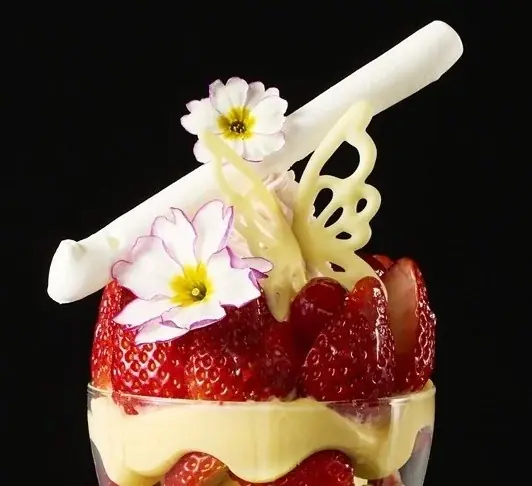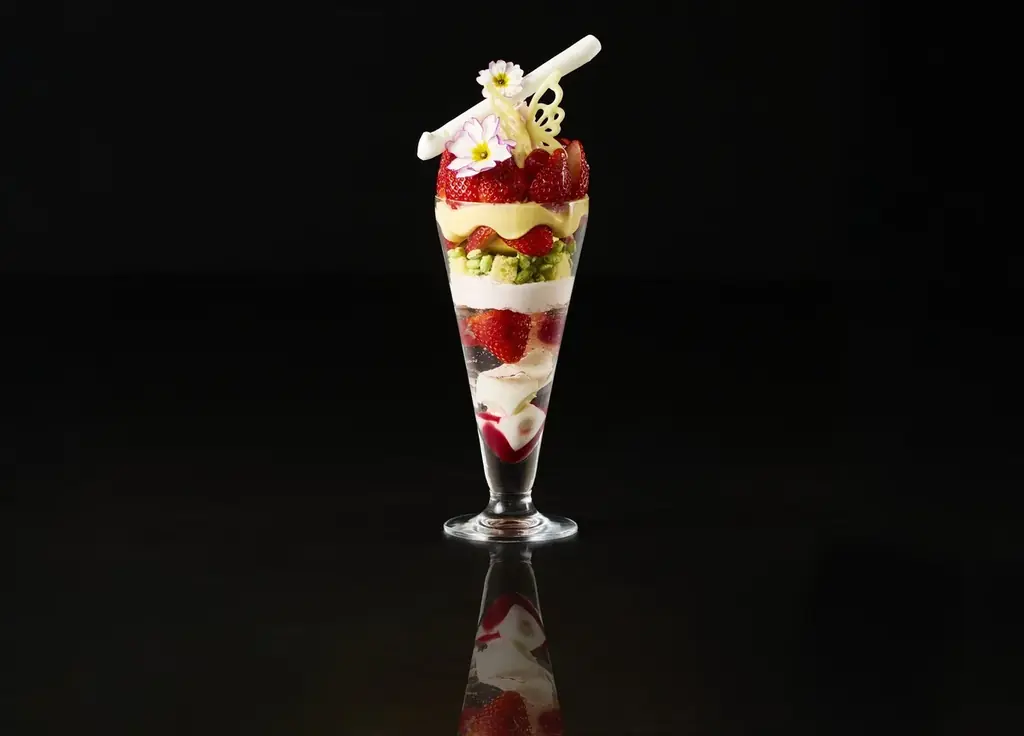 今回のパフェは「桜の香り」と「色鮮やかなストロベリー」を軸に、食感・温度・香りの変化を組み合わせて一つのコースのように設計されています。トップの装飾は視覚的なアクセントでありつつ、最初の一口から最後まで変化が続くように層が組まれています。
