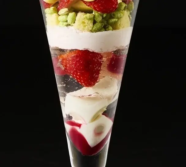 上記は素材と配置の一覧であり、食べ進めるごとに桜の香りが繰り返し現れつつ、ストロベリーの酸味やカスタードのコク、抹茶の香ばしさが交互に立ち上がる設計です。メレンゲやライスパフによる食感の差も意識されており、単調にならない組み立てになっています。