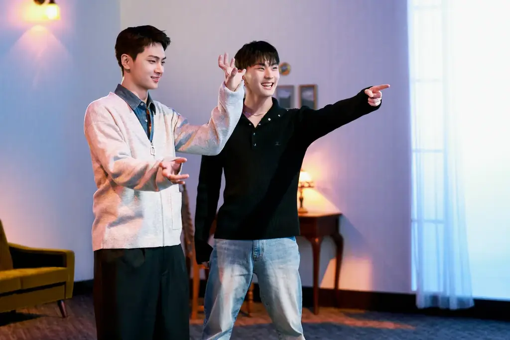 会場には公式商品の販売エリア(MERCHANDISEエリア)が設けられており、その壁面にはJUNGWONとJAYによる大きな直筆サインが書き入れられました。二人はサインの大きさに言及しつつ、メンバーの存在感を直に感じられるスペースとして設置されたこのエリアでショッピングを楽しんでいます。