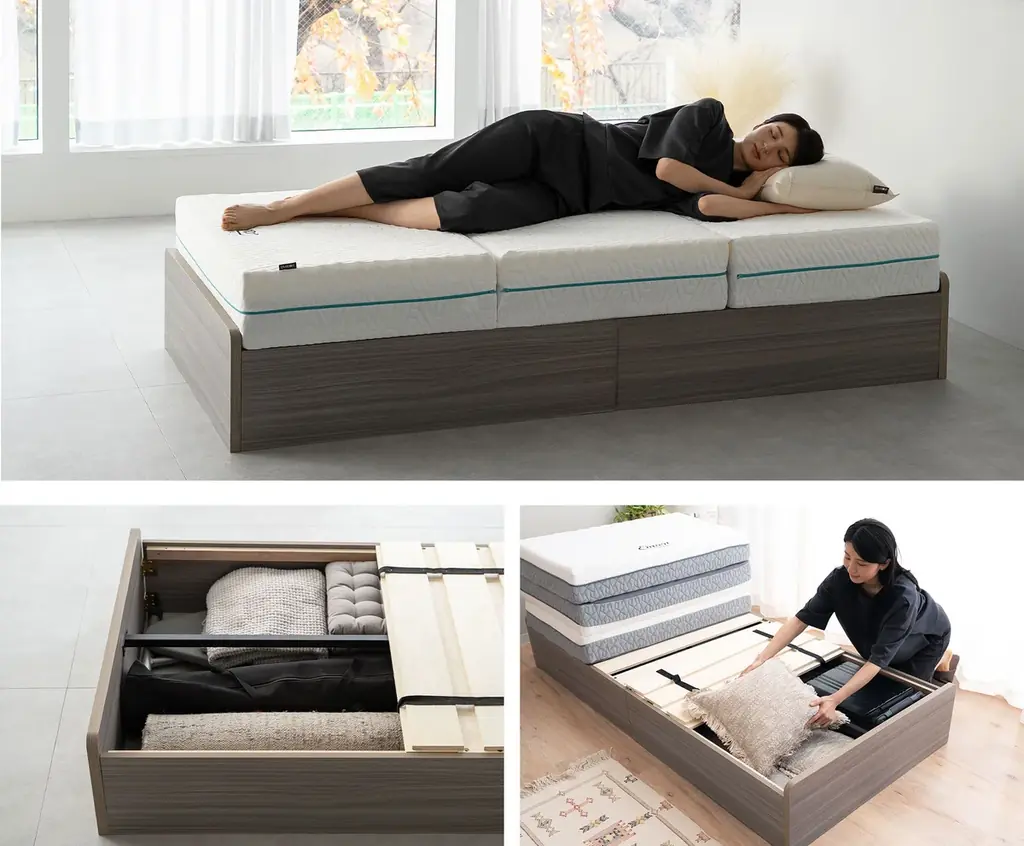 また、三つ折りマットレスとの相性を重視した動線設計により、マットレスを折るだけで収納部に簡単に手が届きます。引き出し式収納のように横方向のスペースを必要としないため、ベッドを壁付けして使用しても収納の出し入れに支障がありません。