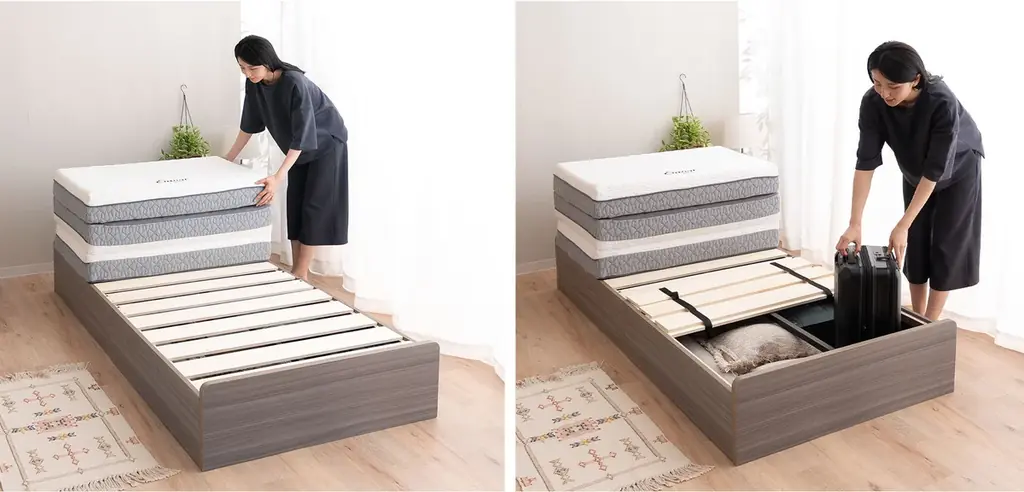 収納アクセスはシンプルで確実です。ベッド床面のすのこ板をめくるだけなので可動部が少なく、故障や経年による動作不良の懸念を抑えています。三つ折りマットレスを組み合わせれば、折るだけで収納に素早く手が届くため、頻繁に出し入れする物が多い環境にも適しています。