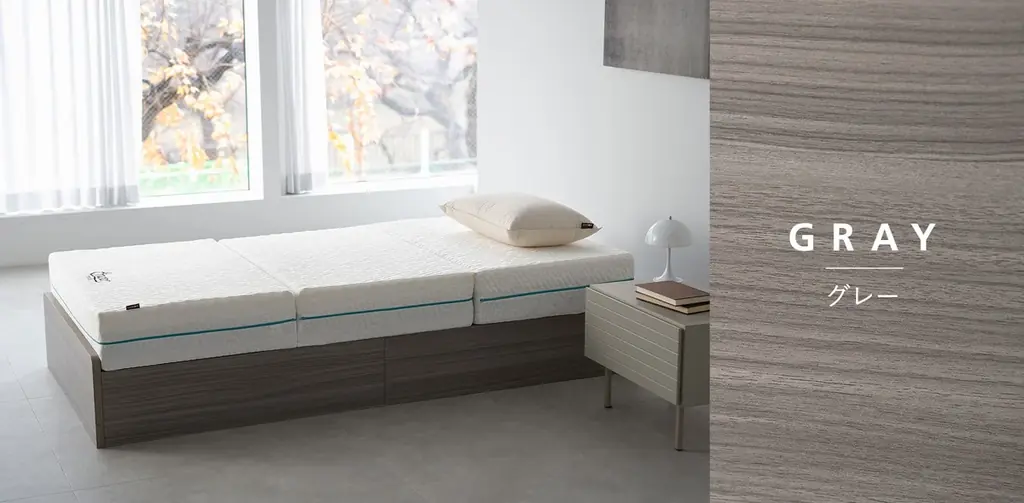 ネバコは見た目にも配慮した設計です。グレーの木目フレームは生活感を抑えるミニマルな佇まいを目指しており、インテリアの調和を損なわず自然に馴染みます。収納付きベッドでありがちな「生活感の出やすさ」を抑え、ホテルのベッドボトムのような印象を与えることを意識したデザインです。