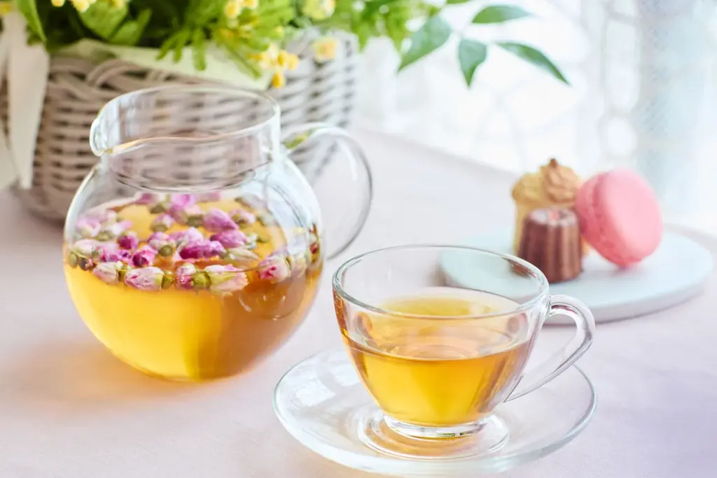 当プログラム限定でブレンドされたオリジナルのフラワーティーが提供されます。お湯をゆっくり注ぐと、北海道のシンボルであるハマナスの花が浮かぶ仕様です。桜の葉とハマナスの香りがふわっと広がり、すっきりとした味わいが特徴となっています。