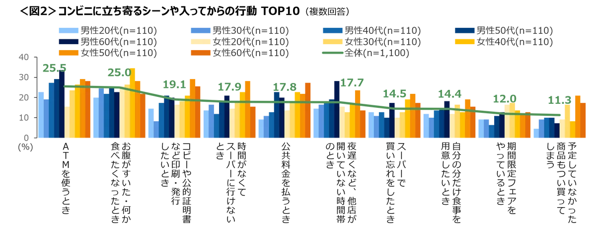 利用者の来店シーンおよび入店後の行動は、利便性に直結する項目が上位を占めました。トップ3は「ATMを使うとき」「お腹がすいた・何か食べたくなったとき」「コピーや公的証明書などの印刷・発行をしたいとき」で、性年代別に細かな差異が見られます。